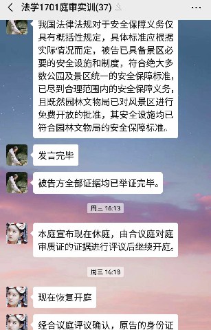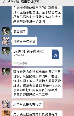在之后的法庭辯論階段,法官組學生依照民事訴訟法規(guī)定的程序進行審理,原告組、被告組學生根據(jù)審判長的指揮分別發(fā)出起訴狀、答辯意見、證據(jù)圖片在微信群上,由此展開舉證、質(zhì)證,向證人發(fā)問。