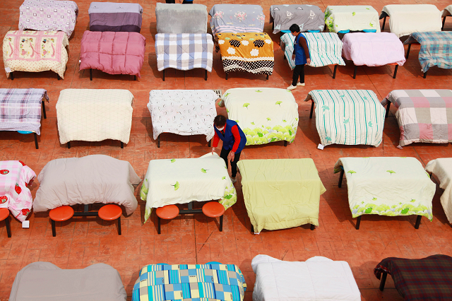 “工作量很多大,人手還是比較缺的。我們先把有需要的學(xué)生寢室都統(tǒng)計(jì)好。南邊的寢室,被子可以晾曬在走廊。北邊的寢室,就需要拿下來,曬在學(xué)校的廣場。我們先把學(xué)校食堂很重的餐桌搬出來,再用洗潔精和消毒水清洗干凈,再在桌子上曬被子!睏顭钫f,“公寓最高有七層,大的被子,一次只能抱一床下來,力氣大的,可以抱兩床。走樓梯下來,到最后感覺手都不是自己的了。等傍晚晾曬結(jié)束,再把被子拿上去。一天下來,臉曬得通紅,衣服脫了一件又一件,走得上氣不接下氣,腳和手都軟掉了。”