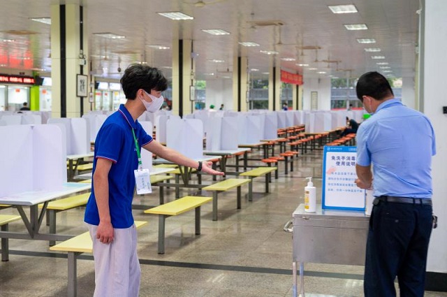 食堂入口處發(fā)消毒液,并有人指導怎么洗手。同學們都知道,餐桌就餐時,消過毒的手,能讓餐桌保持清潔衛(wèi)生。這還不夠,任何一個人在餐桌上吃完飯后,立即有食堂人員為該餐位進行消毒。