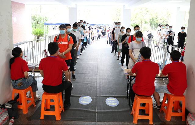 當(dāng)三位一體測試遇上疫情防控,除了緊張的考試氣氛外,學(xué)校大力加強(qiáng)了防控措施。學(xué)校利用隔離設(shè)施專門開辟了候考與考試場地,實(shí)行單向通行,安排了工作人員和志愿者為考生服務(wù)。考生在進(jìn)入校門時都要檢查健康表和測量體溫,進(jìn)校口和考試區(qū)域都安排了經(jīng)驗(yàn)豐富的防控醫(yī)生處理發(fā)熱考生、體溫異常者復(fù)檢等特殊情況。