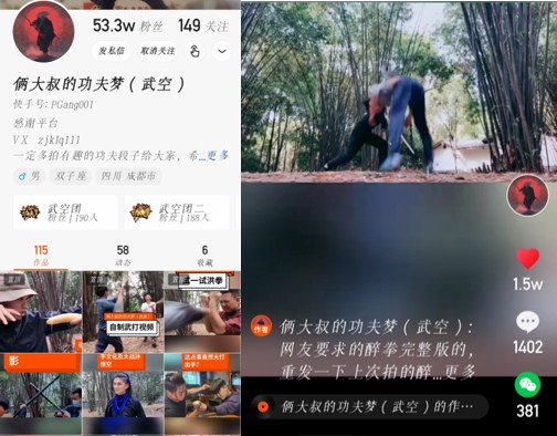 張繼坤在快手上注冊一個賬號,名叫“倆大叔的功夫夢(武空)(快手號:PGang001),專門用來發(fā)布他與師兄弟自拍自導(dǎo)的武打視頻,目前,他已在快手上發(fā)布了116個視頻,擁有54.1萬的粉絲量。張繼坤的視頻里,主要以武打?yàn)橹鳎锶、洪拳、五郎八卦棍各路棍法、拳法?yīng)有盡有。張繼坤的視頻里面偶爾會穿插一些小劇情,讓視頻顯得豐富生動。比如在猴拳的視頻中,化名為硬猴拳文彪的張繼坤與師兄王群一開場就是激烈的對打,打了一分多鐘,在張繼坤即將勝利的時候,王群突然拿出一根香蕉,原本暴躁的猴子張繼坤突然停下,接過香蕉吃起來。這樣突如其來的轉(zhuǎn)變讓很多網(wǎng)友哭笑不得,“這樣的小包袱嚇我一跳。”“打斗十分鐘,不如一根香蕉!碑(dāng)然也有網(wǎng)友只關(guān)注到武打的場面,“我仿佛又看到了十幾年前的武打片,沒有多余的特效。”“看得我熱血沸騰!薄氨冉^大部份的電影和電視劇好看!边@個1分53秒的視頻,播出后獲得了10多萬的點(diǎn)贊和500多萬的播放量。