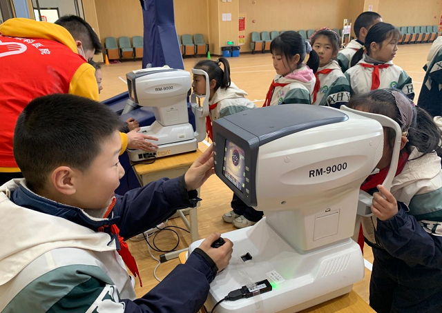 互動視力檢查初體驗區(qū)則排起了長龍,同學們在志愿者的指導下,有模有樣的操作著電腦驗光儀,為小伙伴檢測視力,儼然一副“小小驗光師“的模樣。