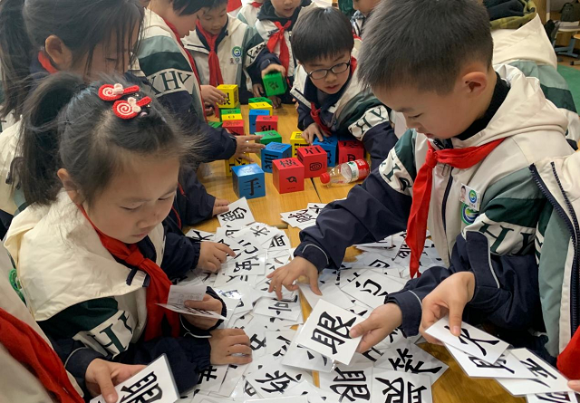 經(jīng)過“‘字’眼‘字’語”成語大比拼區(qū)域,一個小同學興奮的拉住記者說“老師,老師,我找齊‘火眼金睛’啦!”在這里,他認真尋找?guī)А把邸弊值某烧Z,玩得不亦樂乎。