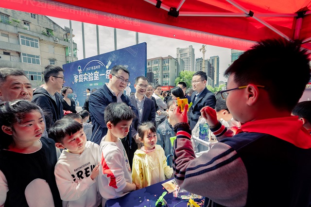 觀展的孩子和家長饒有興趣地參與各個(gè)家庭實(shí)驗(yàn)室攤位的科學(xué)演示和互動交流。