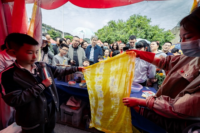 溫州市籀園小學(xué)學(xué)生葉明軒、吳雨軒的植物扎染實(shí)驗(yàn)室,采用紅花、梔子等天然材料進(jìn)行布料的染色,制作的彩色哈達(dá)讓大家非常感興趣。面對博導(dǎo)們的提問,他們對答如流。
