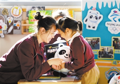 圖為教師帶領孩子們了解北京冬奧會吉祥物,學習冬奧知識。