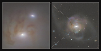 利用MUSE的觀測(cè)數(shù)據(jù)以及來(lái)自哈勃太空望遠(yuǎn)鏡的數(shù)據(jù),該團(tuán)隊(duì)確認(rèn)NGC 7727中的物體確實(shí)是超大質(zhì)量黑洞。較大的黑洞位于NGC 7727的中心,其質(zhì)量相當(dāng)于太陽(yáng)的1.54億倍,而相伴黑洞的質(zhì)量大約是太陽(yáng)的630萬(wàn)倍。而且這對(duì)黑洞之間的距離僅1600光年,也打破了兩個(gè)超大質(zhì)量黑洞之間最近距離的紀(jì)錄。