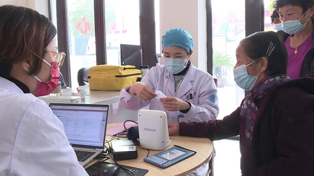 在瑞安市飛云街道瑞云社區(qū)黨群服務(wù)中心,來自市第二人民醫(yī)院的醫(yī)務(wù)人員正在為老人們開展新冠疫苗接種工作。在預(yù)檢環(huán)節(jié),醫(yī)務(wù)人員為老人們測(cè)量血壓、心率,并詳細(xì)詢問老人的健康狀況和既往病史。