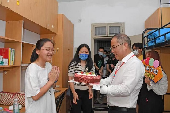 “大學(xué)報到第一天,剛好趕上自己過生日,第一次離開父母過生日還真不習(xí)慣,也不知道該準(zhǔn)備什么。光顧著準(zhǔn)備開學(xué)的東西,都忘了生日可以吃蛋糕!笔称放c生物工程學(xué)院新生明靜來自海寧,收到蛋糕的時候非常激動,“學(xué)校居然記得我的生日,書記還給我題字,開啟我大學(xué)生活的序幕,這太讓我驚喜了!”