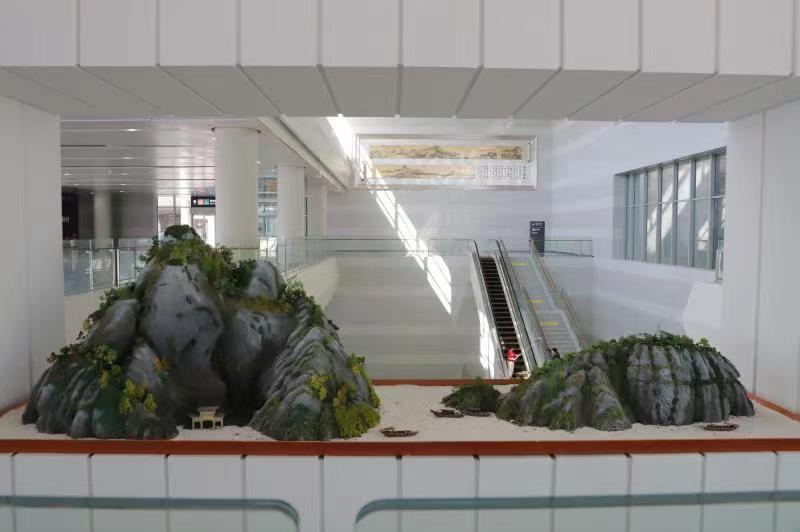 在換乘廳東側(cè)鏤空區(qū)域則設有“枯山水盆景”,此處采用一段類似以《富春山居圖》實景地的桐廬山水,與對面的《富春山居圖》選段遙相呼應、互為補充。
