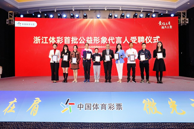 12位優(yōu)秀運(yùn)動(dòng)員和知名媒體人,受聘成為首批浙江體彩公益形象代言人,他們分別是體操奧運(yùn)冠軍江鈺源,羽毛球世界冠軍王琳,中國大陸首位闖進(jìn)美網(wǎng)男單正賽球員吳易昺,帆船亞洲冠軍徐臧軍,男排亞洲冠軍張景胤,圍棋世界冠軍、職業(yè)九段檀嘯,女子圍棋全國冠軍、職業(yè)四段潘陽等7位優(yōu)秀運(yùn)動(dòng)員,以及浙江廣電集團(tuán)資深新聞評(píng)論員舒中勝、浙江之聲主持人思寧、浙江交通之聲主持人小白、浙江音樂調(diào)頻主持人果然、浙江經(jīng)視主持人楊琨等5位知名媒體人。