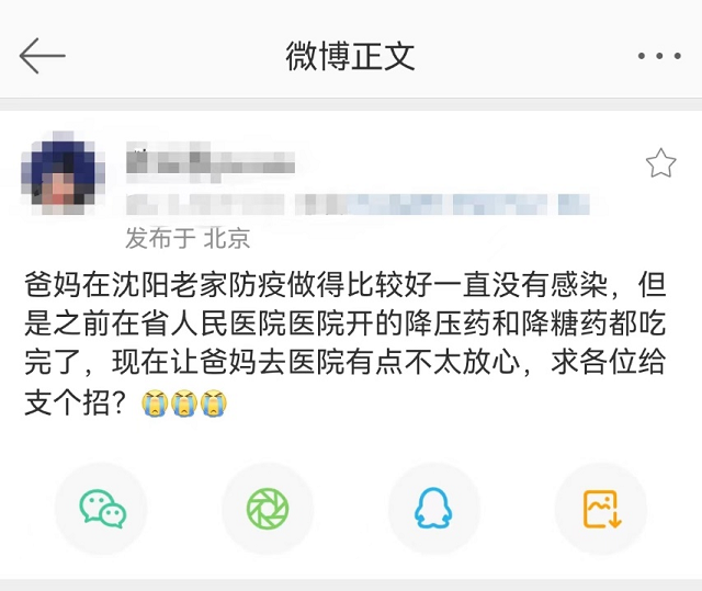 “爸媽在沈陽老家防疫做得比較好一直沒有感染,但是之前在省人民醫(yī)院醫(yī)院開的降壓藥和降糖藥都吃完了,現(xiàn)在讓爸媽去醫(yī)院有點(diǎn)不太放心,求各位給支個(gè)招?”