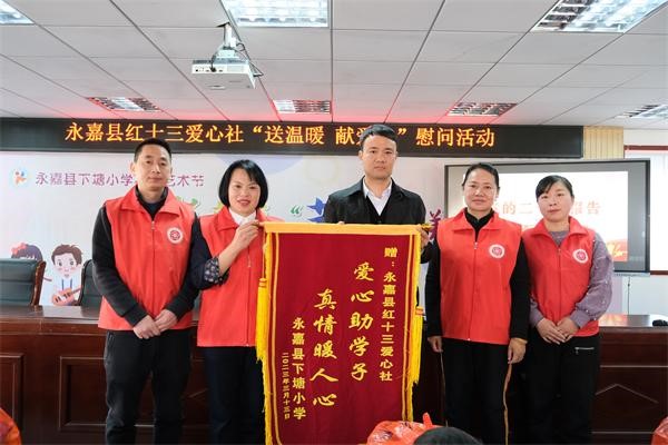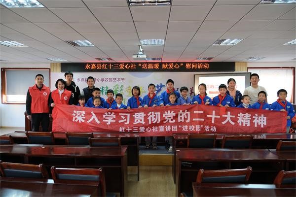3月14日,紅十三愛心社志愿者到永嘉縣下塘小學進行黨的二十大精神宣講,為孩子們送上零食大禮包和獎學金。