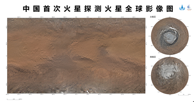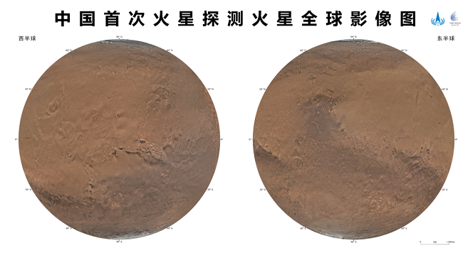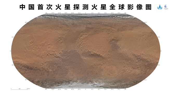 我國首次火星探測任務(wù)——天問一號獲取的包括影像圖在內(nèi)的一批科學探測數(shù)據(jù),將為人類深入認知火星作出中國貢獻。天問一號任務(wù)環(huán)繞器中分辨率相機,于2021年11月至2022年7月歷時8個月,實施了284軌次遙感成像,對火星表面實現(xiàn)了全球覆蓋。地面應(yīng)用系統(tǒng)對獲取的14757幅影像數(shù)據(jù)進行處理后得到火星全球彩色影像圖。
