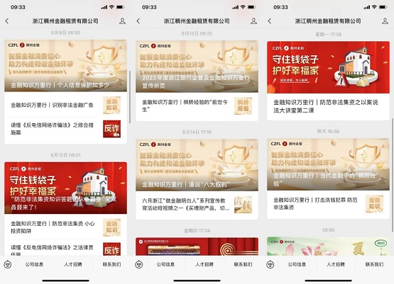 充分利用官微渠道,密集宣傳擴大影響。稠州金租充分利用網(wǎng)絡(luò)傳播覆蓋面廣的優(yōu)勢,在官方公眾號發(fā)布“守住錢袋子?護好幸福家”與“普及金融知識萬里行活動”相結(jié)合的多種形式的宣傳作品;顒悠陂g,連續(xù)發(fā)布“金融知識萬里行|楓橋經(jīng)驗的“前世今生””、“金融知識萬里行|防范非法集資小心投資陷阱”等系列內(nèi)容策劃,發(fā)布“金融知識”合集近二十條,將非法集資的概念與生動形象的案例進行有效結(jié)合,提高可讀性,提升閱讀者的法律意識與警惕性,并組織公司員工積極轉(zhuǎn)發(fā)至微信群、朋友圈,深化非法集資、金融知識縱向普及宣傳力度,向每位關(guān)注者傳達金融安全的重要性。
