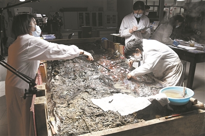 “泥土的清理一定要輕,準(zhǔn)備移走的漆片必須做好標(biāo)注……”7月初,記者來到山東大學(xué)室內(nèi)考古發(fā)掘與保護(hù)實(shí)驗(yàn)室時,該校文化遺產(chǎn)研究院副教授、該實(shí)驗(yàn)室現(xiàn)場負(fù)責(zé)人朱磊正指導(dǎo)學(xué)生對湖北曾侯寶墓葬M168中的馬鎧甲漆片做清理工作。