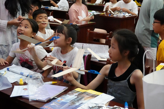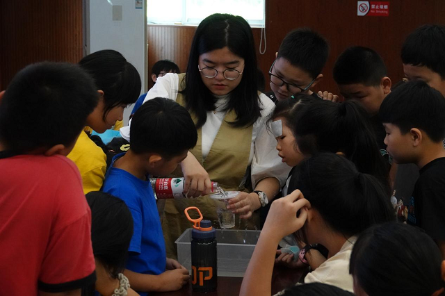 “在礦泉水瓶的不同高度扎幾個孔,往瓶內(nèi)加滿水,從瓶子前方看,可以看到水射出的距離不相同,越低處的水,射出的距離越遠,這是什么原理呢?”科普課堂上,大學生黃纖纖通過實驗演示,讓孩子們直觀感受壓強的應(yīng)用與影響壓強大小的因素。在她通俗易懂的語言中,科學課堂不僅充滿趣味,也有效啟發(fā)了孩子們對科學現(xiàn)象的思考。