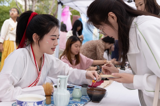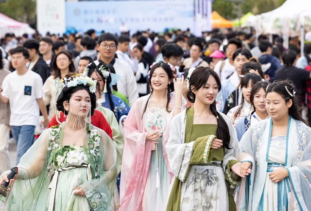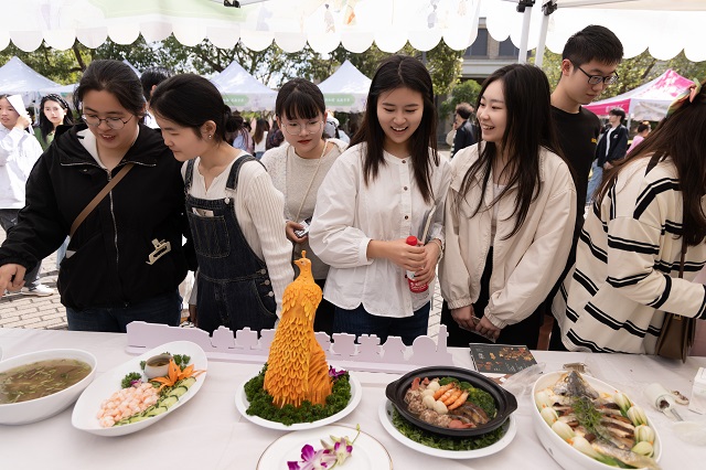 本次國風(fēng)文化節(jié)推出了十大主場活動和十大學(xué)院分會場活動。其中,“古韻煥美”國風(fēng)潮市集帶來了各類傳統(tǒng)美食、傳統(tǒng)手作和古風(fēng)飾品,富有濃濃傳統(tǒng)文化氣息的生活市集,為師生和市民帶來了獨特的游園體驗。秋風(fēng)起,佳景時,“曲韻流芳”戲曲面對面活動設(shè)置了折子戲表演、戲劇妝造展示、戲劇周邊互動、戲曲臉譜作品展等環(huán)節(jié),彰顯中國戲曲文化的深厚底蘊!皾h韻華章”漢服文化展演秀選擇以漢服成人禮、歷朝漢服秀、留學(xué)生漢服交流、旗袍走秀等活動內(nèi)容,將歷朝服飾之美融入當(dāng)下校園生活,增強師生華夏民族文化自信!昂m崅鞒小狈沁z體驗項目則邀請漁民號子、舟山船模、海洋剪紙、漁繩結(jié)、海洋刺繡、海洋布藝等眾多非遺傳承人進校,開展非遺項目展覽體驗活動,弘揚舟山海洋文化的獨特魅力。師生和市民紛紛表示,浙江海洋大學(xué)國風(fēng)文化節(jié)是繼校園櫻花節(jié)后最盛大的活動,開放的姿態(tài)是吸引觀眾的最大亮點。