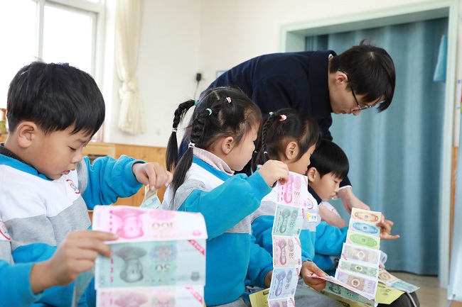 為了開闊孩子們的視野,讓孩子們了解不同面值的人民幣紙幣的特征、種類、用途等,豐富幼兒的社會知識,12月20日,浙江長興縣太湖街道中心幼兒園邀請長興農(nóng)商銀行新塘支行的工作人員走進幼兒園,教大班兒童認識人民幣,開展人民幣科普,幫助幼兒園老師和小朋友們增強防偽、反詐意識。(通訊員 馮曼)