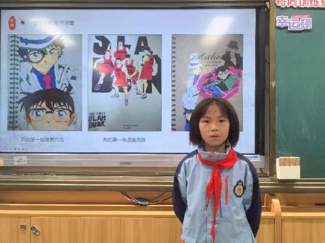 “有人喜歡用文字表達(dá),而我,更喜歡用畫筆記錄美好、表達(dá)美好、想象美好,特別享受畫筆拿在手上的感覺,可以肆意用線條、色彩去繪就自己的所想所愿!敝v臺(tái)上,金華東苑小學(xué)五(5)中隊(duì)的葉昕予自信地向隊(duì)員們分享著自己的“趣成長(zhǎng)”。