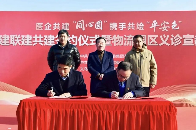 當天,義烏市中心醫(yī)院與國際陸港集團舉行了“醫(yī)企共建‘同心圓’攜手共繪‘平安色’”黨建聯(lián)建共建簽約儀式暨物流園區(qū)義診宣教活動。