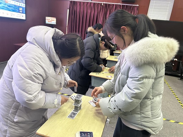 “我覺得立方體的承重能力更強。”年級組教師在科學教師的帶領下分組討論,確定如何搭建穩(wěn)定、承重能力強的紙牌高塔并動手實踐。一張張紙牌在老師們的手中或彎曲或折疊,造型獨特的紙牌塔漸次升高,靈巧的雙手不斷地“添磚加瓦”。經(jīng)過半個小時的努力,形態(tài)各異的紙牌高塔呈現(xiàn)在大家面前。