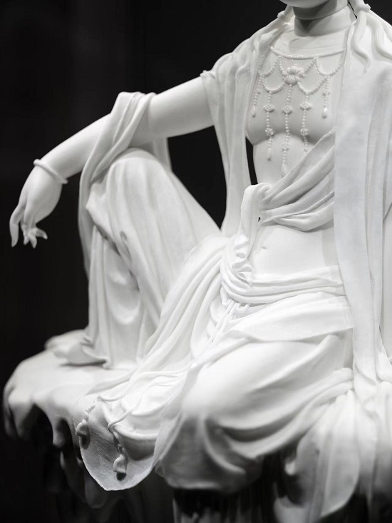 “世界的中國白”展覽是一個(gè)獨(dú)特的跨越3700年的對(duì)話,展品有出土于泉州德化戴云山脈遼田尖山窯址的“原始瓷隹鳥”(3700年前),明朝“中國白”巔峰時(shí)期最具代表性的何派“白釉披坐觀音”。這些作品體現(xiàn)了“Blanc de Chine中國白”3700年間堅(jiān)韌的生命力,各個(gè)階段獨(dú)特的風(fēng)貌。