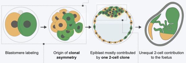 通過(guò)計(jì)算,研究者們發(fā)現(xiàn)在形成的囊胚中,在內(nèi)細(xì)胞團(tuán)中占主導(dǎo)地位的細(xì)胞群平均貢獻(xiàn)了71.25%,也就是說(shuō),最初的兩個(gè)細(xì)胞之一所分裂出的后代中的大部分形成了這個(gè)胚胎結(jié)構(gòu)。而滋養(yǎng)外胚層中占主導(dǎo)地位的細(xì)胞群平均貢獻(xiàn)了外胚層62.86%的細(xì)胞。