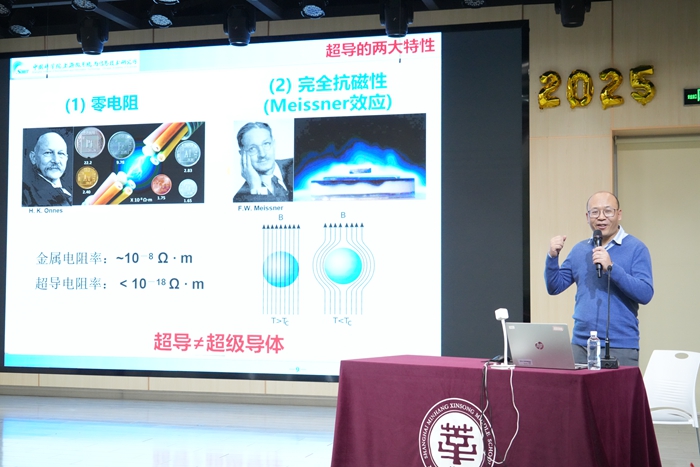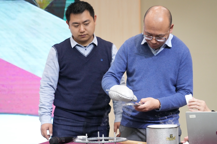從溫度的概念入手,彭煒介紹了華氏溫標、攝氏溫標和熱力學(xué)溫標的發(fā)展歷史,并深入淺出地講解了絕對零度對物理學(xué)研究的意義。通過展示低溫技術(shù)對物質(zhì)狀態(tài)和性能的影響,同學(xué)們對“低溫世界”有了全新的認識。隨后,彭煒通過形象的比喻和演示,讓同學(xué)們直觀感受到超導(dǎo)體的獨特魅力。