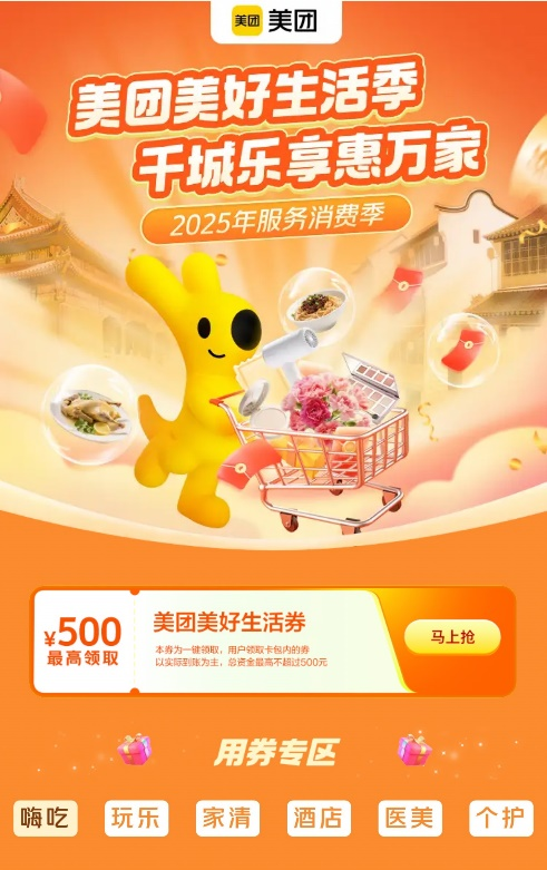 6月3日,2025年“服務(wù)消費(fèi)季”活動(dòng)在江蘇省南京市啟動(dòng)。美團(tuán)積極響應(yīng),已上線美團(tuán)美好生活季·千城樂(lè)享惠萬(wàn)家專題活動(dòng),將發(fā)放10億元優(yōu)惠券,著力促進(jìn)服務(wù)消費(fèi)高質(zhì)量發(fā)展。