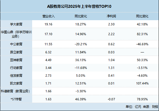 A股教育上市公司的營(yíng)收TOP10的格局相對(duì)穩(wěn)定,2025年上半年,學(xué)大教育、華圖山鼎、中公教育、昂立教育、豆神教育等穩(wěn)居前五,但其中亦發(fā)生微妙的變化,凸顯學(xué)大教育的競(jìng)爭(zhēng)優(yōu)勢(shì)。