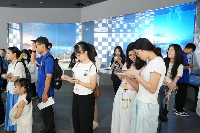 與此同時(shí),在“智造寧波”展廳內(nèi),一場(chǎng)別開生面的“探館尋智之旅”同步拉開帷幕;顒(dòng)以沉浸式體驗(yàn)與互動(dòng)探索相結(jié)合的方式,為學(xué)生打造了深度感知科技魅力的獨(dú)特場(chǎng)景。在講解員的帶領(lǐng)下,學(xué)生們近距離接觸300余家寧波本土企業(yè)的硬核成果,內(nèi)容涵蓋新能源汽車智能電池管理系統(tǒng)、工業(yè)機(jī)器人精密焊接技術(shù)、“寧波造”特種纖維等新材料,以及海洋工程裝備的深海探測(cè)技術(shù)等多個(gè)前沿領(lǐng)域。實(shí)物模型的細(xì)節(jié)呈現(xiàn)、動(dòng)態(tài)演示的直觀展示與互動(dòng)裝置的趣味操作相輔相成,讓原本抽象的“科技”變得可知、可感、可探索,幫助學(xué)生們清晰直觀地了解寧波企業(yè)的創(chuàng)新實(shí)力與發(fā)展?jié)摿Α?!--enorth cms news protect start-->