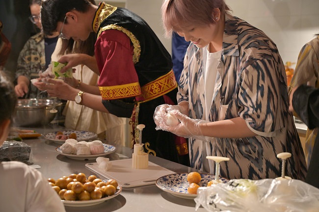 “雙節(jié)同慶”的溫情里,“表白”更添暖意!傲啃【邸惫蚕韽N房里,人文與外語學院學生會組織多民族學子圍在一起,揉面、包餡、壓模,共同制作月餅,讓民族情與愛國情在美味中交融!昂透髯逋瑢W一起做月餅,就像和家人團圓,這是給祖國最好的祝福!”來自新疆的阿斯艷·艾拜卜拉同學捧著剛出爐的月餅說。