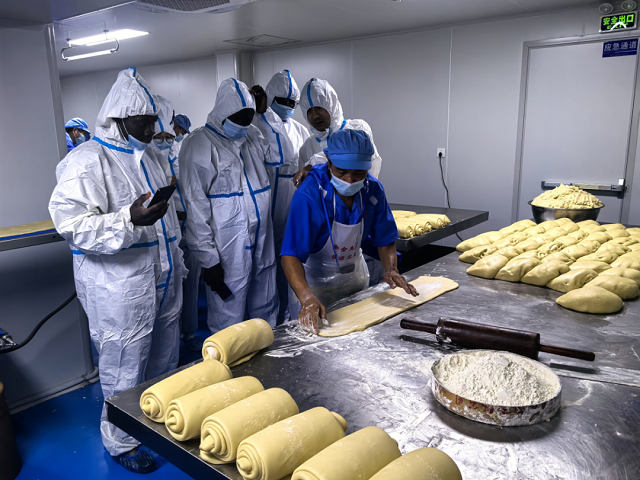 在“月餅之鄉(xiāng)”義烏市義亭鎮(zhèn),海外友人參觀了業(yè)界知名的億民食品廠,近距離觀摩義烏特色中秋月餅的制作流程。從和面、包餡到壓模、烘烤,大家仔細(xì)觀看每一個(gè)生產(chǎn)環(huán)節(jié),并不時(shí)用視頻記錄下這一陌生而有趣的制作過(guò)程。食品廠的工作人員也不斷向海外友人詳細(xì)介紹了月餅制作過(guò)程中所涉及到的一些科學(xué)知識(shí)。當(dāng)看到各式各樣的月餅從生產(chǎn)線末端整齊出爐時(shí),參觀隊(duì)伍中發(fā)出陣陣贊嘆。