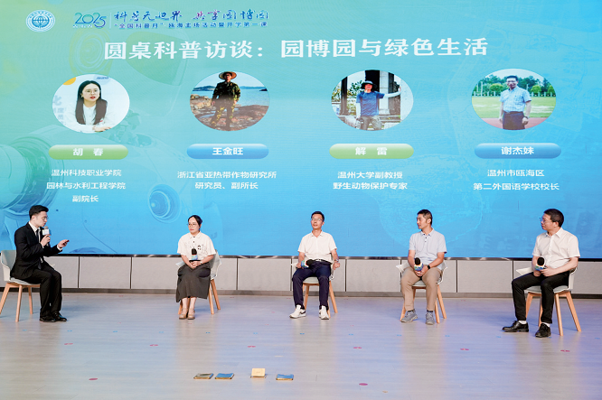 在圓桌訪談環(huán)節(jié),專家學(xué)者與教育工作者共同圍繞“園博園與綠色生活”展開交流。溫州科技職業(yè)學(xué)院副院長(zhǎng)胡春暢談園林藝術(shù)如何走進(jìn)市民日常,浙江省亞熱帶作物研究所副所長(zhǎng)王金旺介紹珍稀植物保護(hù)的實(shí)例,溫州大學(xué)副教授解雷解讀甌海的野生動(dòng)物資源,甌海二外校長(zhǎng)謝杰妹則分享學(xué)校如何借勢(shì)園博會(huì)推進(jìn)科普教育。