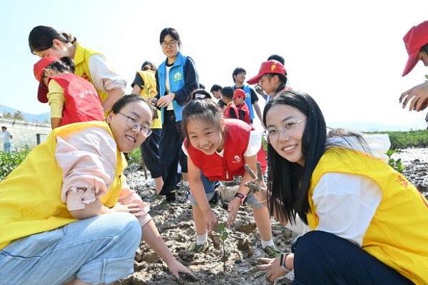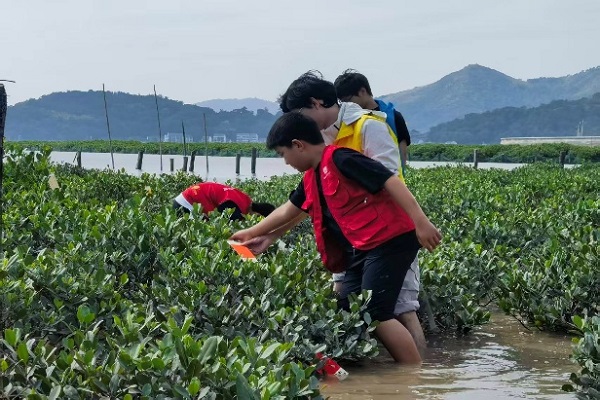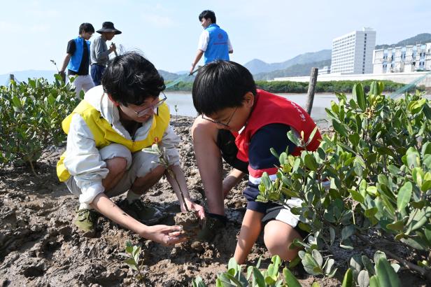“紅樹(shù)苗什么時(shí)候會(huì)長(zhǎng)高呀?”“它會(huì)喜歡這里嗎?”灘涂上,小學(xué)生們化身為“灘涂園丁”,擼起袖子和褲腿,與本碩博黨員志愿者們一道,深一腳淺一腳地踩進(jìn)柔軟的灘涂里,種下一株株紅樹(shù)苗。