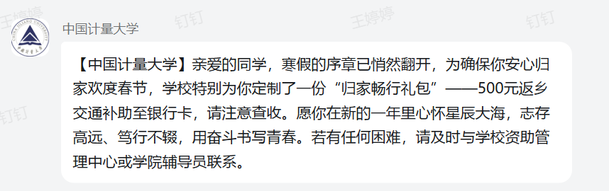 歲末寒冬,返鄉(xiāng)在即。近期,中國計(jì)量大學(xué)為家庭經(jīng)濟(jì)困難學(xué)生發(fā)放“寒假返鄉(xiāng)路費(fèi)補(bǔ)貼”,用“量大暖”的育人溫度,護(hù)航學(xué)子溫暖返鄉(xiāng)。